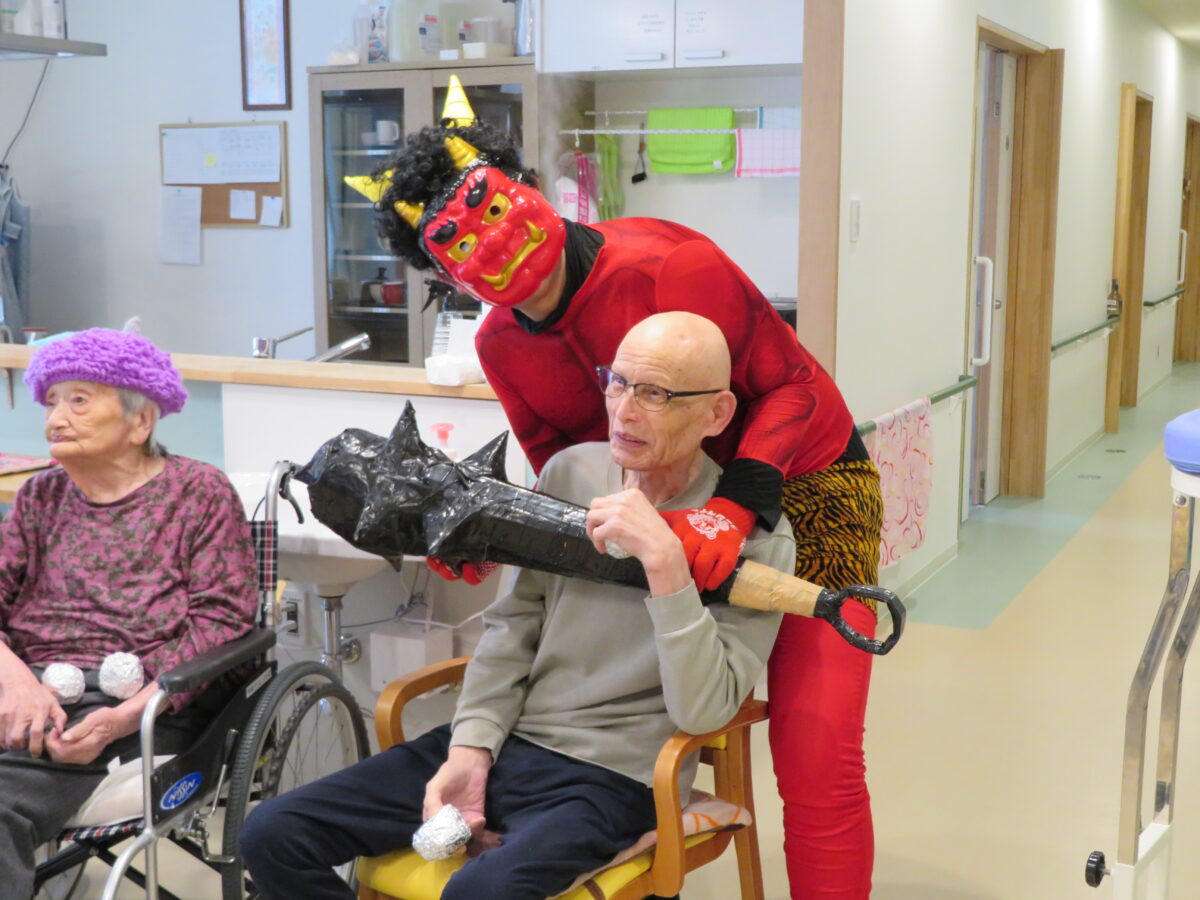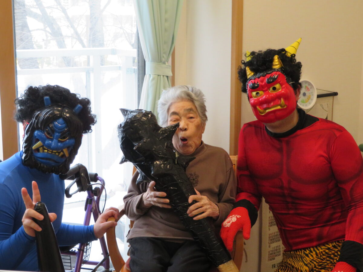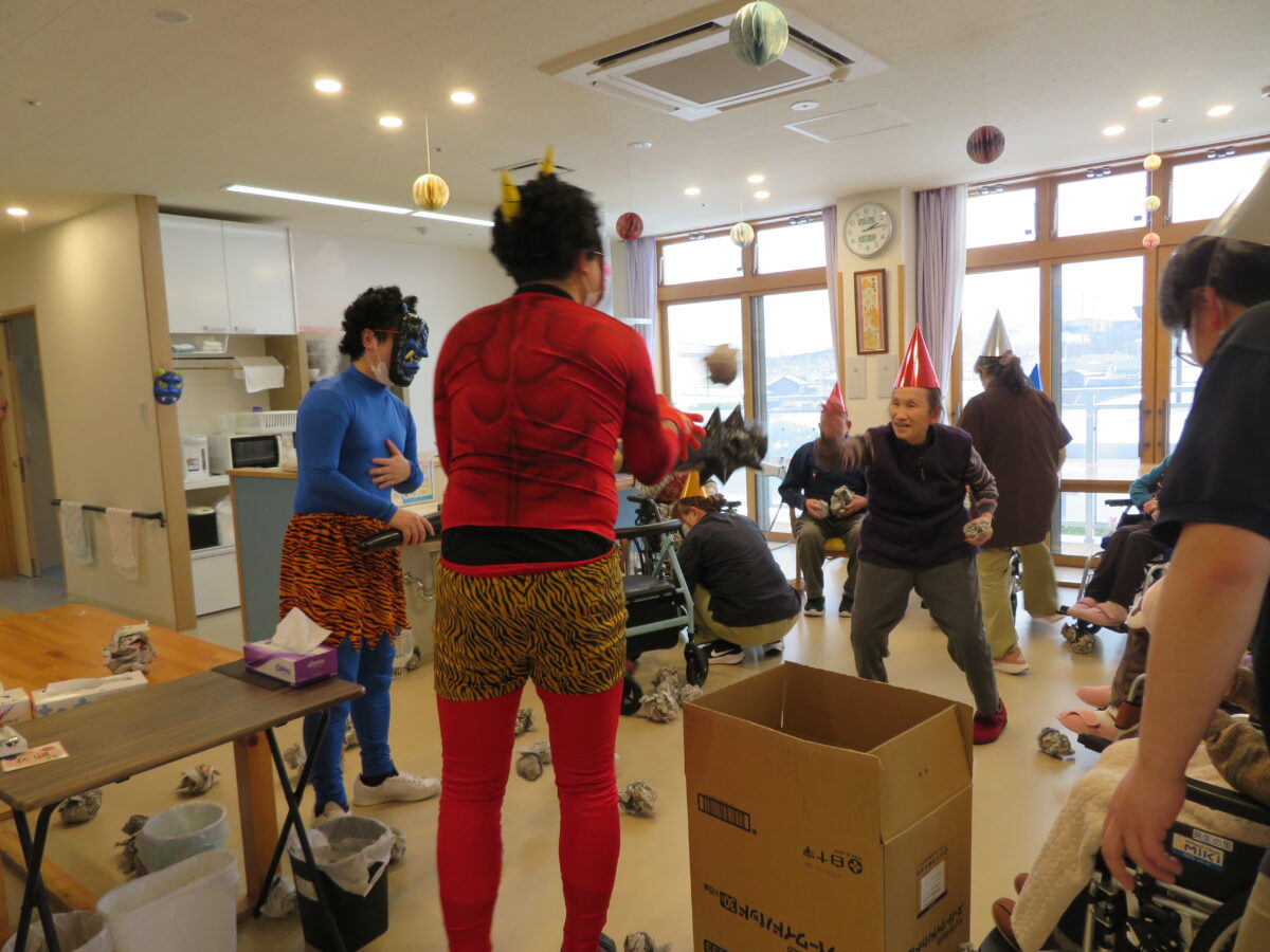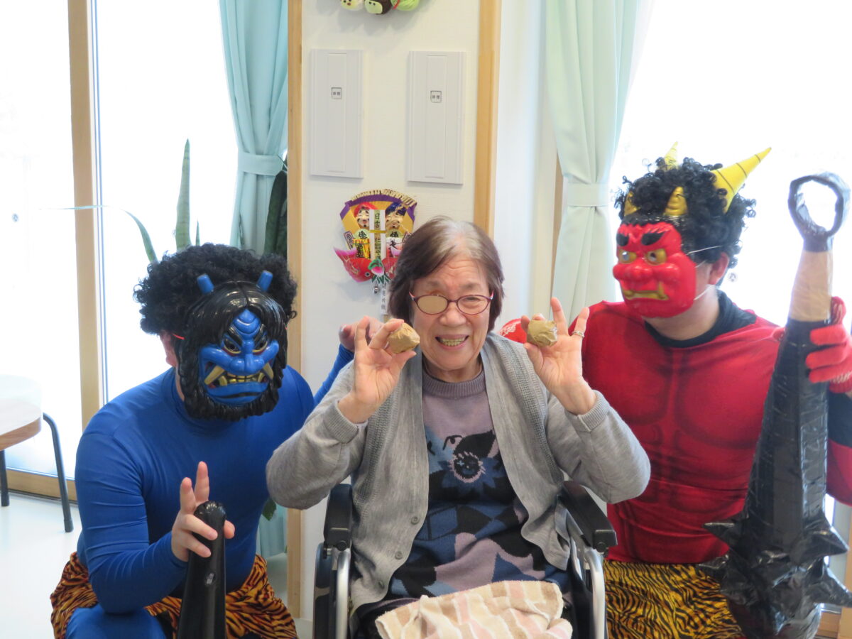 赤鬼・青鬼の登場に、「鬼は外!福は内!」と元気な声が響き、笑顔あふれる節分となりました。